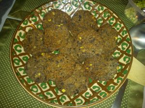 I use my spatula to continuously shape the bean paste into patties. The millet and flour are nice binding agents and add flavor. Keep patties warm in oven until all are cooked. Top with pumpkin seed sauce or tofu cream…yummy!