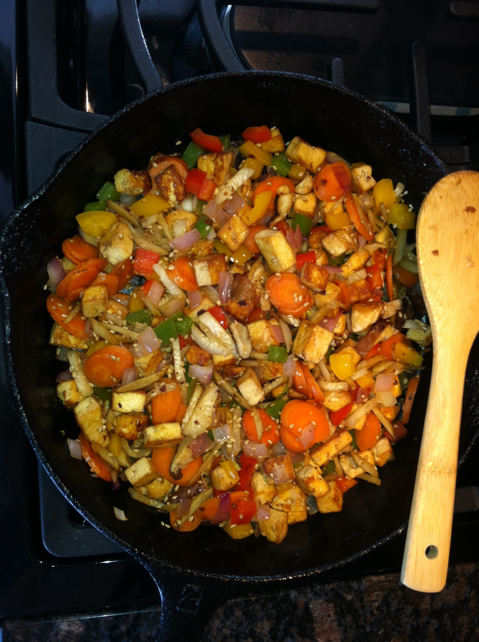 Then using safflower oil stir fry the tofu keeping aside the remaining shoyu for about 4-5 minutes until browned. Remove the tofu and add a little more oil to stir fry the vegetables until tender but not soft. Mix together with tofu add remaining shoyu and small amount of water and arrowroot to make clear glaze. Top with toasted sesame seeds.